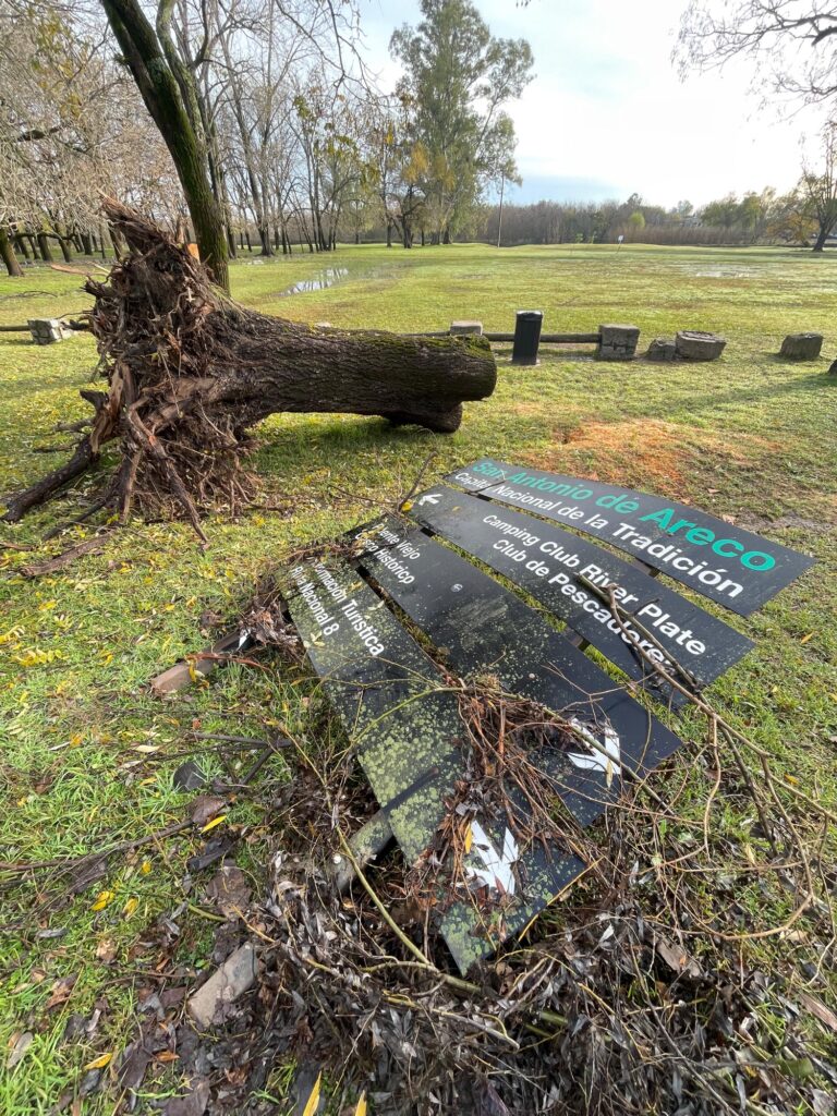 Ya pasaron varios días de la inundación que golpeó con fuerza sobre todo la zona de la costanera del Rio Areco y sin dudas los trabajos de limpieza y de recuperación se hicieron de acuerdo a una lista de prioridades. Pero aún permanece caído sobre una pila de ramas frente al Parque Juan José Guiraldes un cartel indicador de lugares de atractivo turístico.