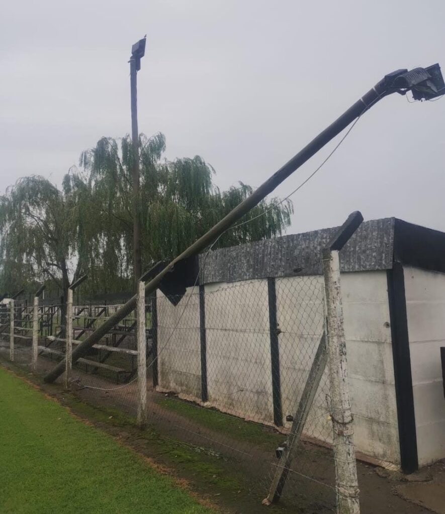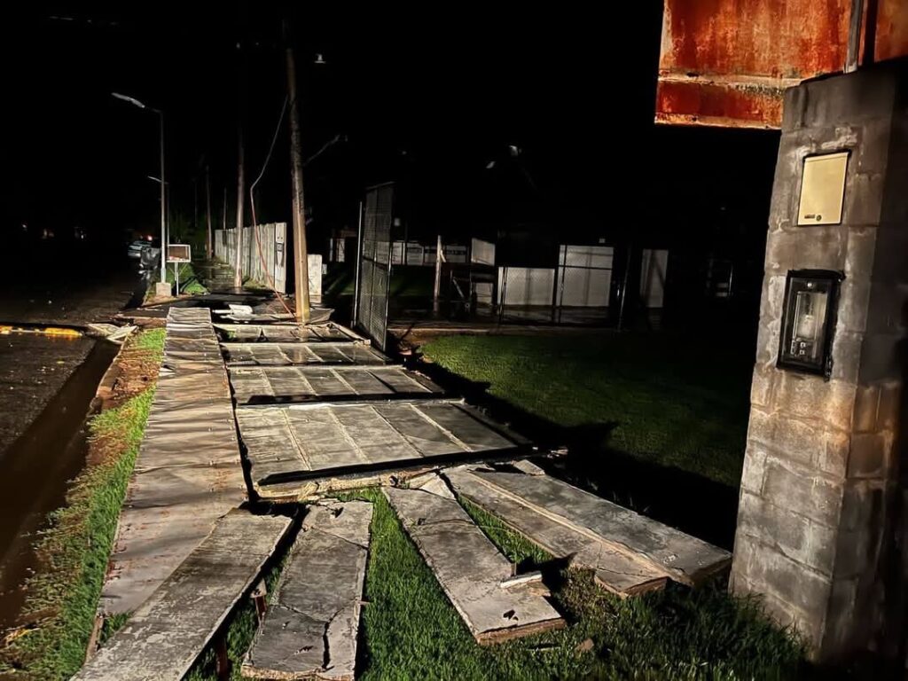 Una de las imágenes más elocuentes fue la del paredón volteado por el viento en la cancha del club Rivadavia en la zona del barrio Saigós, en calle Rivadavia al fondo.