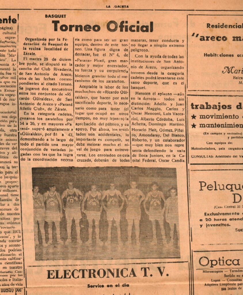 Integraron ese conjunto que disputó el torneo de la Asociación de Zárate: Adolfo Maggio, Carlos Menconi, Luis Vaccarini, Alberto Córdoba, José Luis Achetta, Domingo Martino, Oscar Menconi, Juan Carlos Maggio y Carlos Del Bianco entre otros.