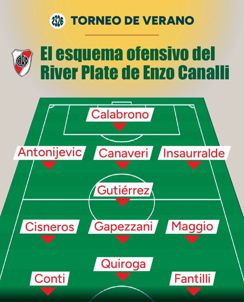 Brian Gutiérrez patrulló delante de la defensa en zona media donde transitaron el mencionado Cisneros, el inteligente Maximiliano Gapezzani, Luis Maggio, que trabajó como volante izquierdo y Alexis Quiroga, que se movió con total libertad, suelto pero sin ser un enganche clásico, que se sumó a los dos delanteros netos: Gabriel Fantilli, 9 de área y Luciano Conti que alternadamente ocupó los dos laterales.