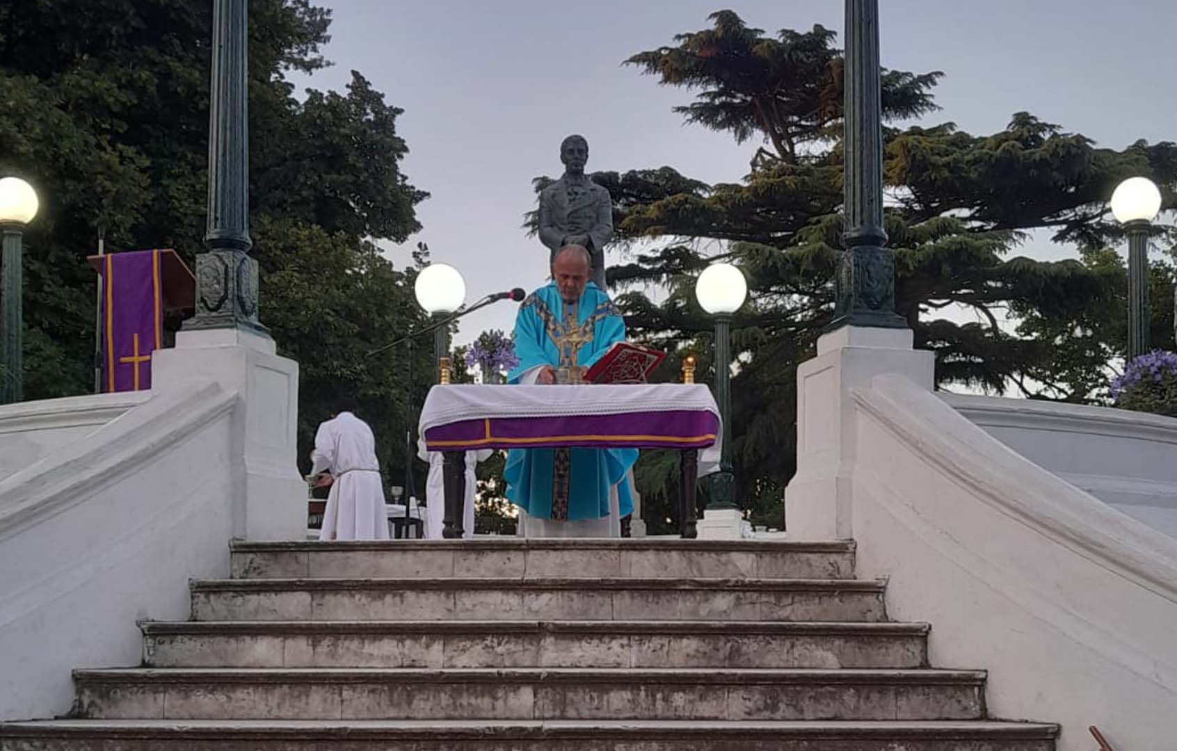 El árbol navideño se encendió con grandes luces circulares, otorgando un clima especial para este tramo final del año en la plaza principal de la ciudad. Antes, el Padre Menghello había celebrado la Santa Misa desde la parte superior de la escalinata de la rotonda.