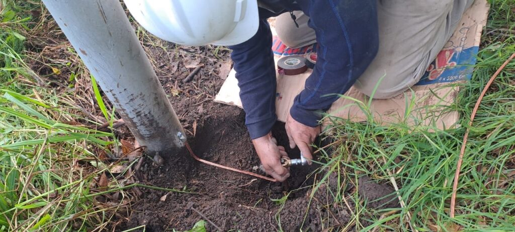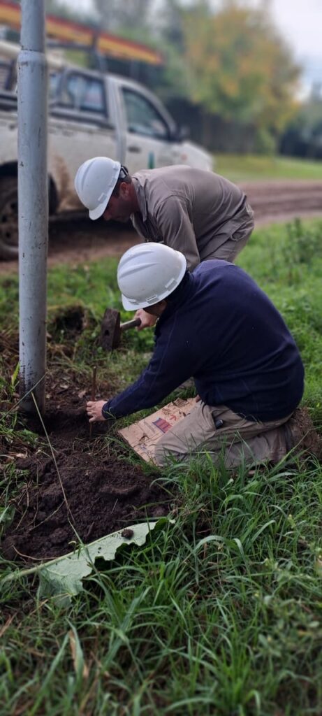 Según se informó desde la entidad, tras un relevamiento realizado en la localidad se detectó que muchas columnas, especialmente las de hierro, no contaban con el sistema de puesta a tierra correspondiente, lo que implicaba un riesgo potencial. Por ese motivo, se avanzó en los últimos días con la colocación de jabalinas en cada una de ellas.