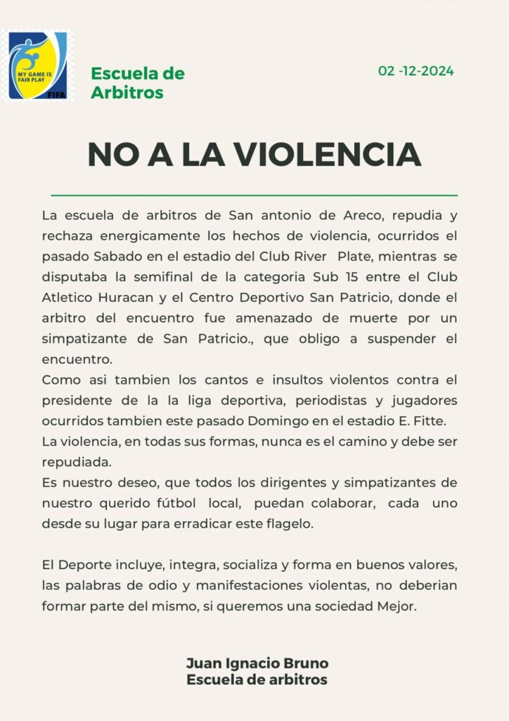 El texto, breve pero concreto, dice lo siguiente: “La escuela de árbitros de San Antonio de Areco repudia y rechaza enérgicamente los hechos de violencia ocurridos el sábado pasado en el estadio del Club River Plate mientras se disputaba la semifinal de la categoría Sub 15 entre el Club Atlético Huracán y el Centro Deportivo San Patricio donde el árbitro del encuentro fue amenazado de muerte por un simpatizante de San Patricio que obligó a suspender el partido.